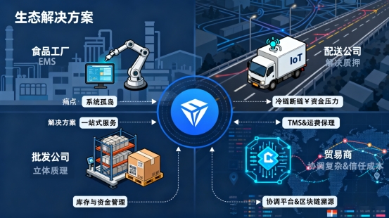 · 配送公司 则通过IoT硬件、运输管理系统(TMS)和运费保理贷款,解决冷链断链与资金压力。