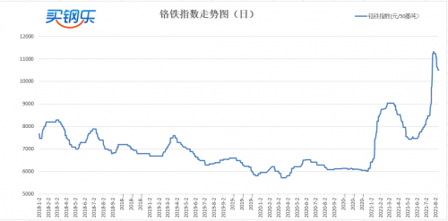 买钢乐高碳铬铁指数价格收于10500元/50基吨,较上周下跌138元/50基吨,跌幅1.3%。