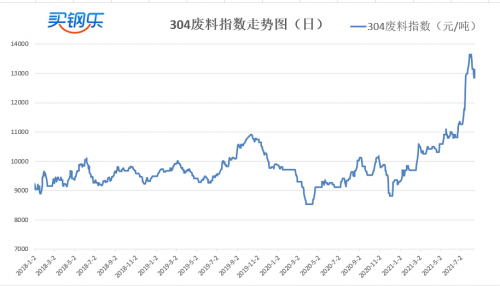 买钢乐304不锈钢废料现货指数收于13130元/吨,较上周下跌30元/吨,跌幅0.23%。