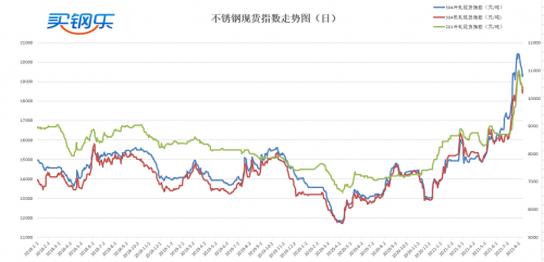 买钢乐不锈钢电子交易304冷轧连三品种收盘于17350元/吨,较上周下跌950元/吨,跌幅5.19%;买钢乐304冷轧现货指数收于19370元/吨,较上周下跌530元/吨,跌幅2.66%;304热轧现货指数收于18700元/吨,较上周下跌300元/吨,跌幅1.58%;201J1冷轧现货指数收于10350元/吨,较上周下跌150元/吨,跌幅1.43%。